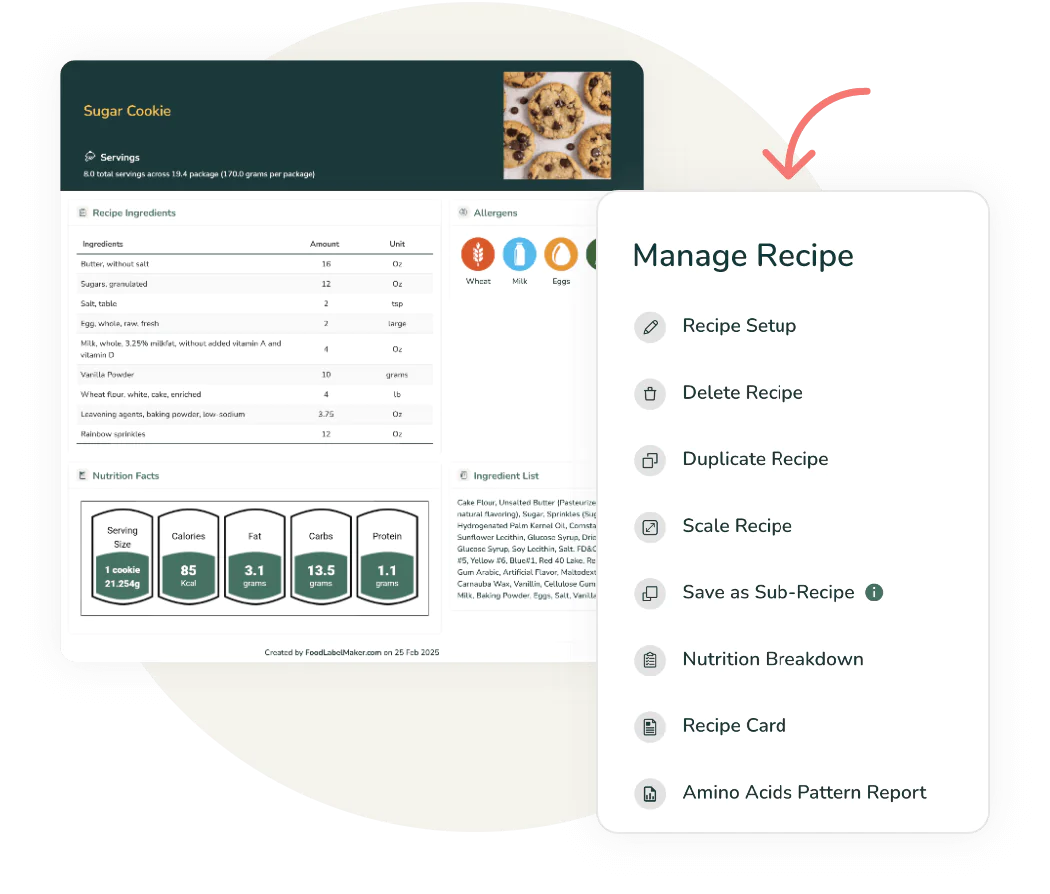 Create sub-recipes, scale up or down recipes, and duplicate with a single click. Get a detailed nutrition breakdown of your ingredients and generate a comprehensive recipe card.