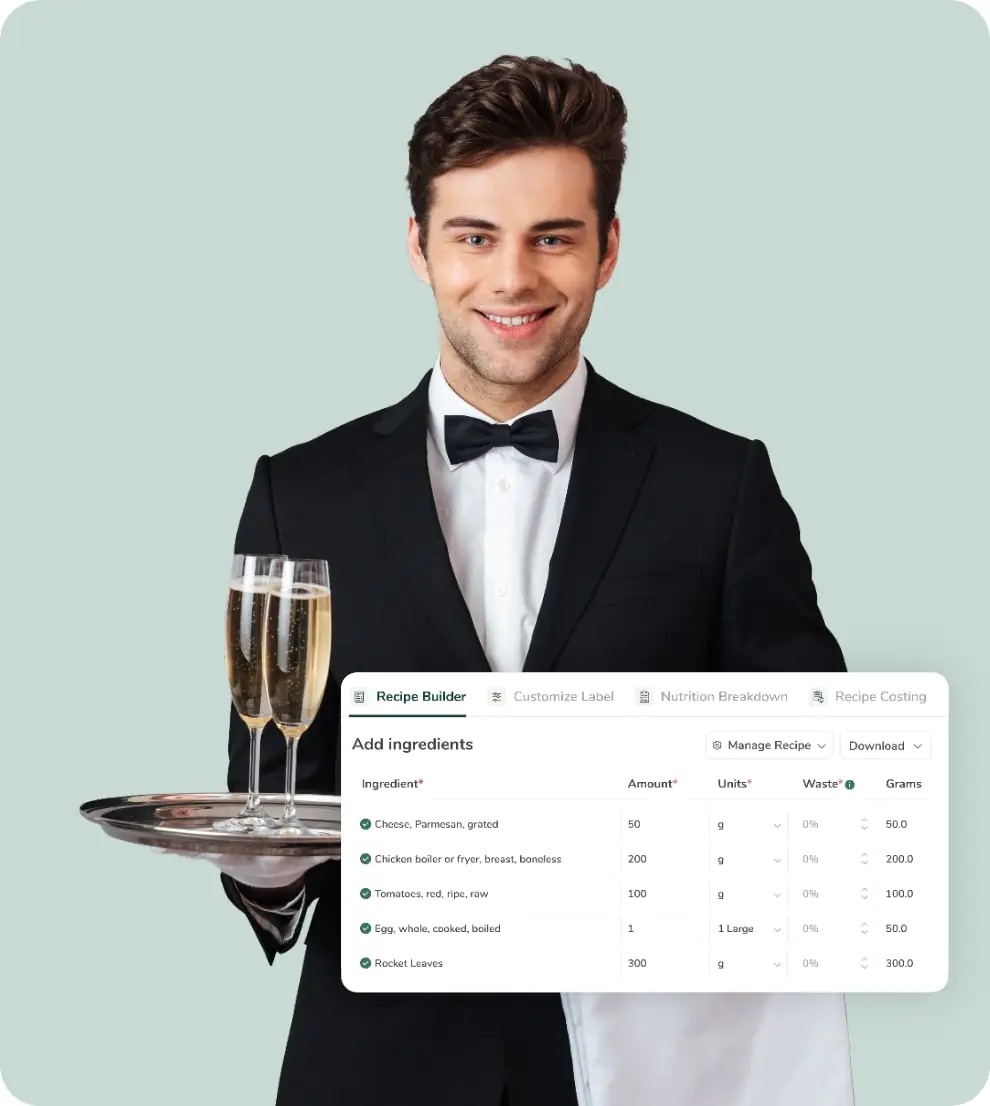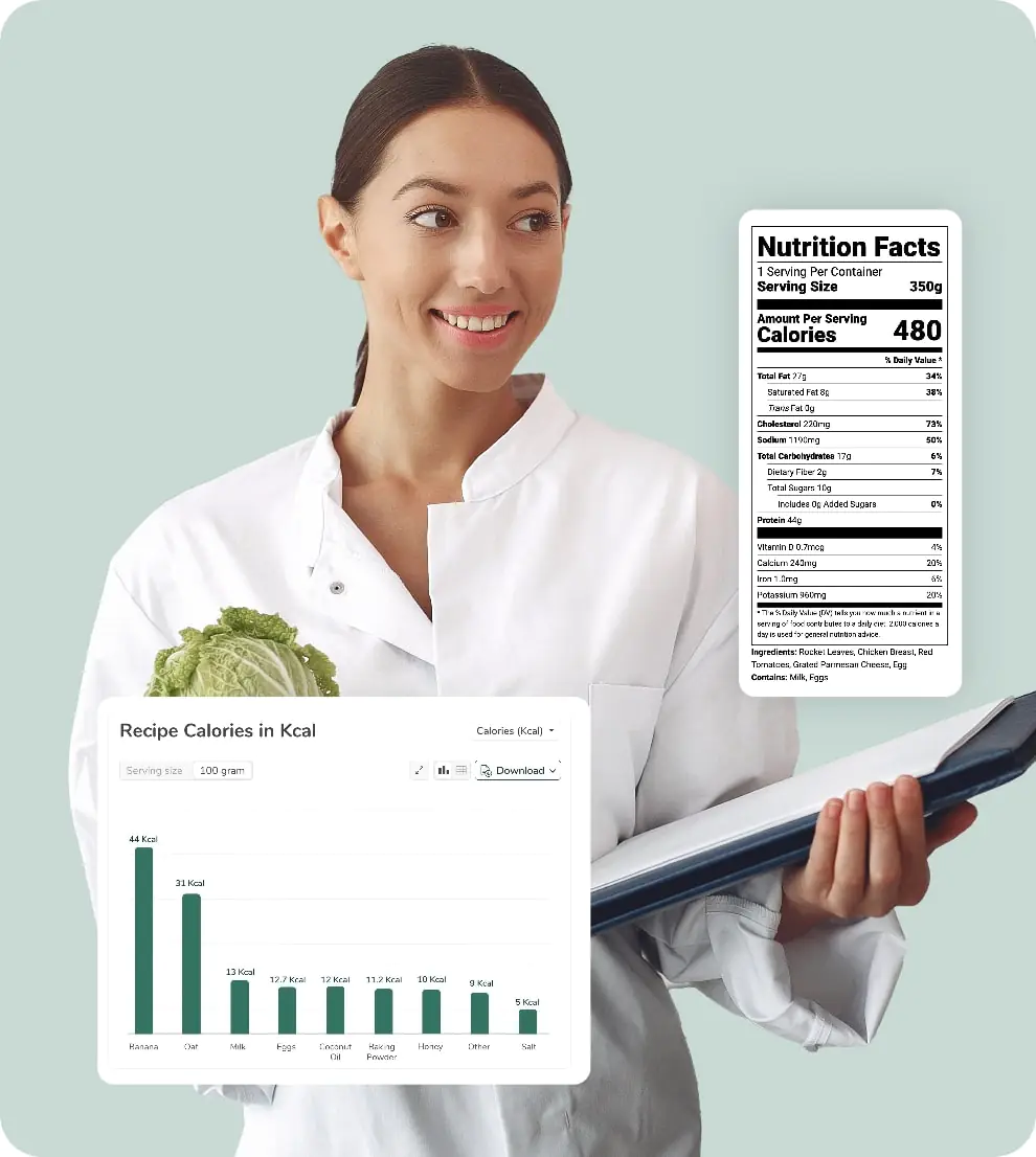 Use our intuitive recipe builder to search ingredients, create sub-recipes, and scale portions up or down. Access over 500,000 verified ingredients.