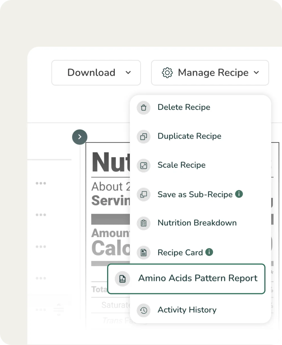 To get your Amino Acids Pattern Report for your current recipe, click on Manage Recipe in the top right corner. Here you can access the values you need to calculate your PDCAAS Score.