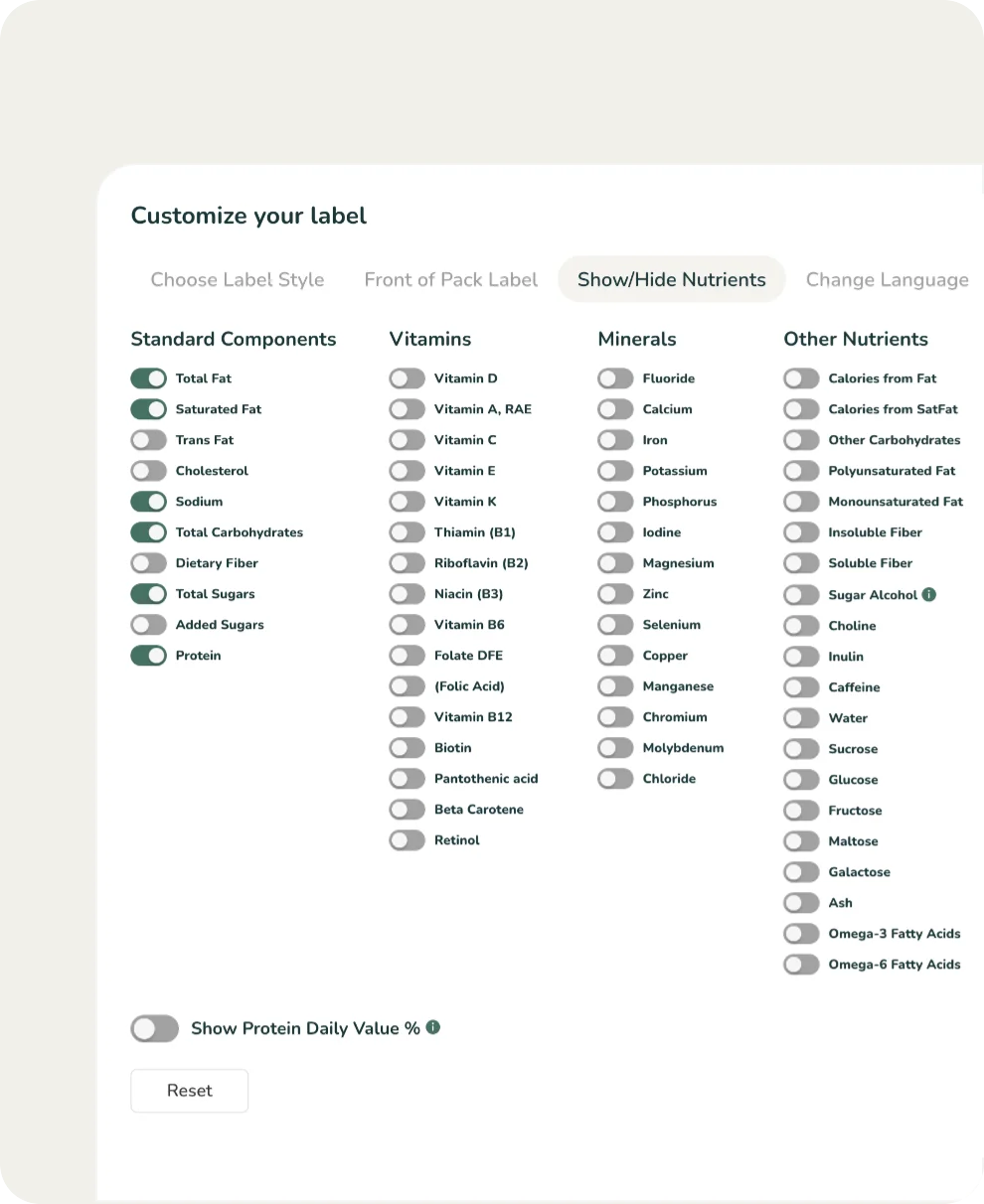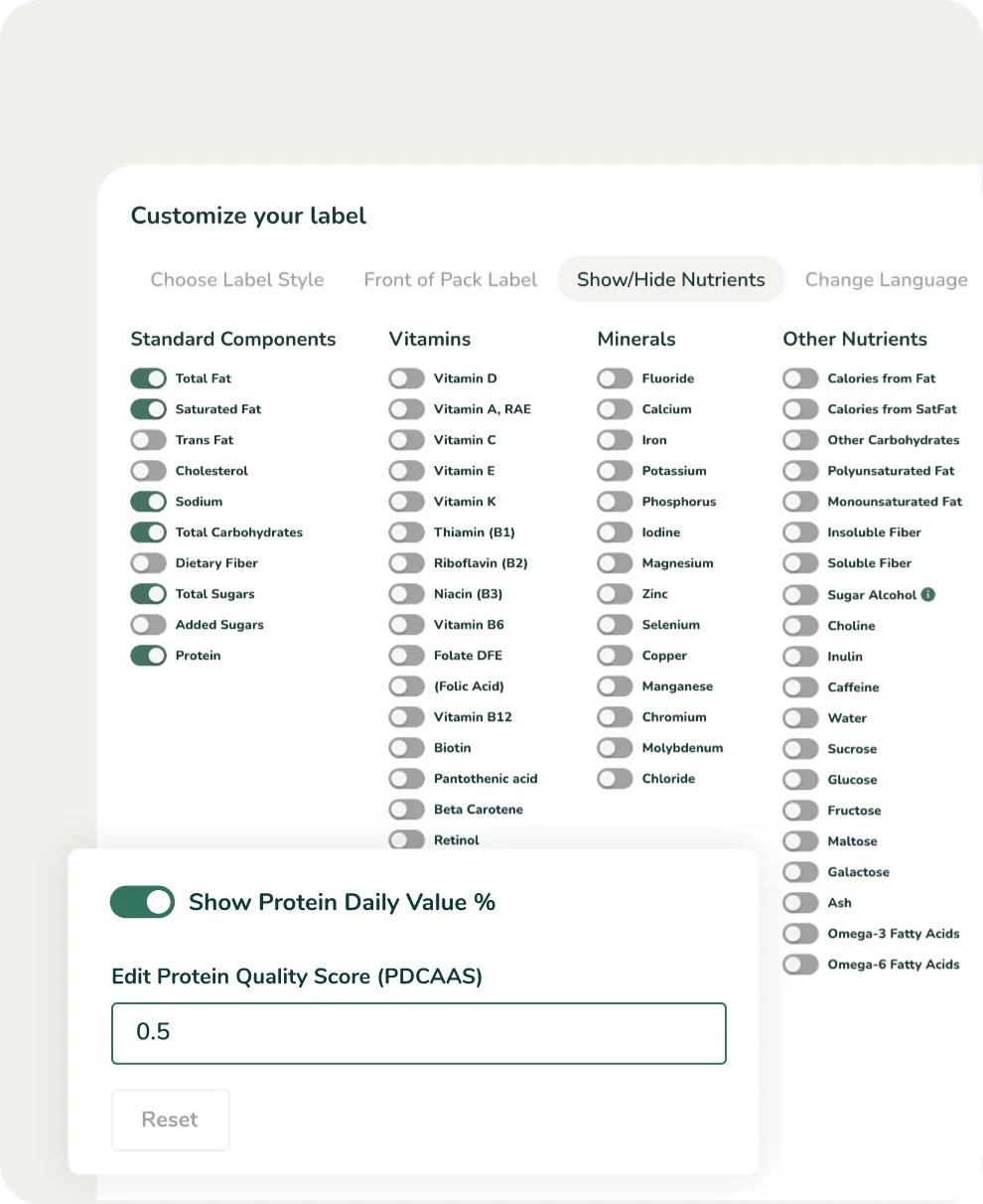 Toggle on the Protein Daily Value %, at the bottom of the page, and you’ll see the percentage (%) come into play on your Nutrition Facts Label. You can now add your Protein Quality Score (PDCAAS).