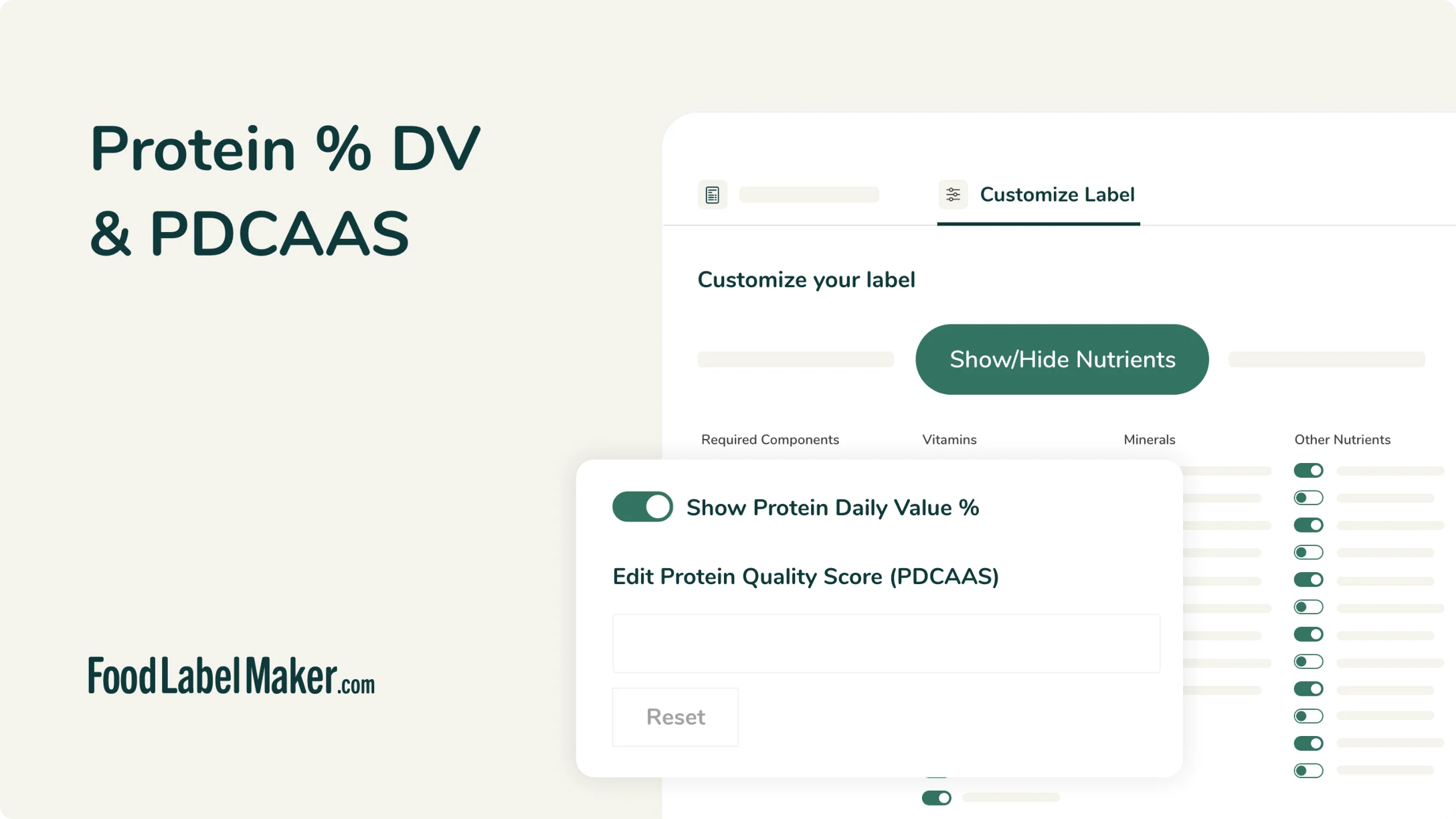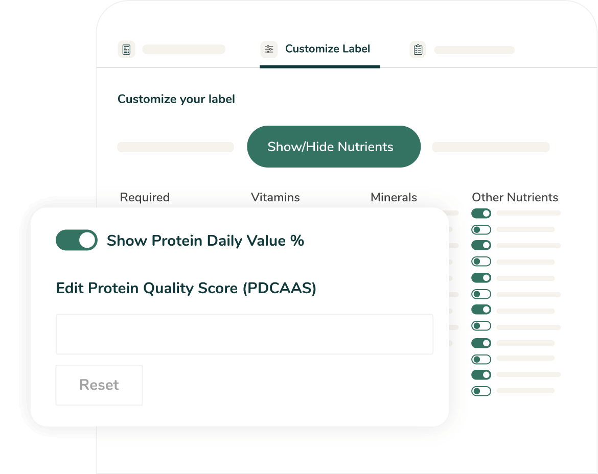 Toggle on the Protein Daily Value %, at the bottom of the page, and you’ll see the percentage (%) come into play on your Nutrition Facts Label. You can now add your Protein Quality Score (PDCAAS).