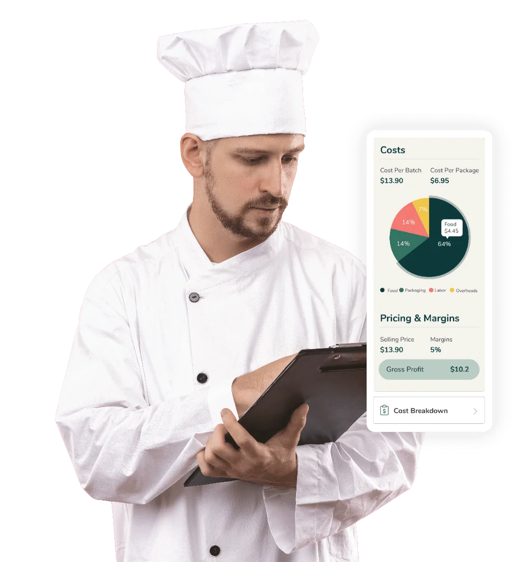 • Optimize Recipe Costs: Input your ingredients’ costs per batch and per package, insert additional expenses such as package, labor, and overhead costs, and set default margins for your recipes.