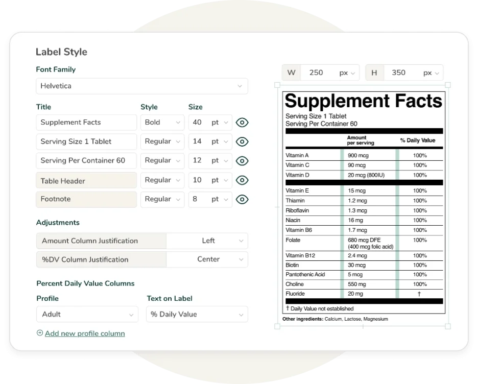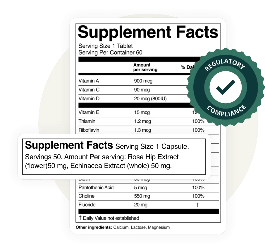 Create accurate Supplement Facts panels with built-in overage adjustments, automated allergen detection, and fully customizable label formats — all aligned with FDA regulations