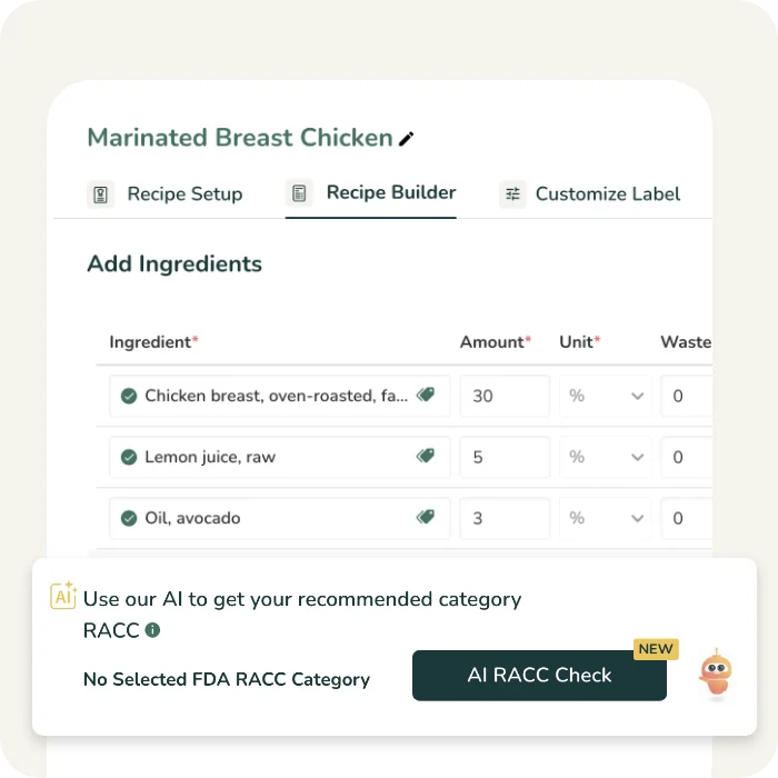 Our tool leverages AI to help you identify the correct FDA RACC category for your product. This ensures your nutritional values, including calories, added sugars, and vitamin D, are calculated against a compliant baseline, removing the uncertainty of manual portioning.