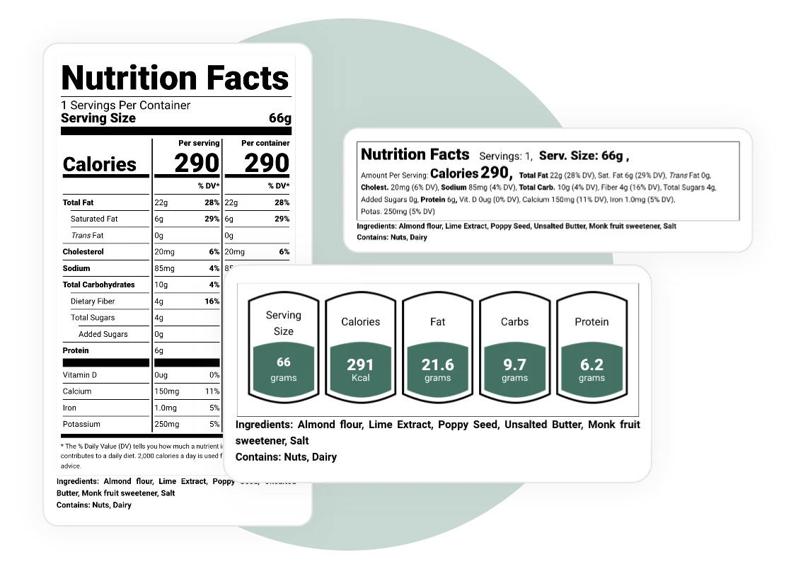 Tailor your labels to fit both your food packaging and brand. Our customization features allow you to toggle specific nutrients on or off for consumer relevance, or switch between layouts with a single click