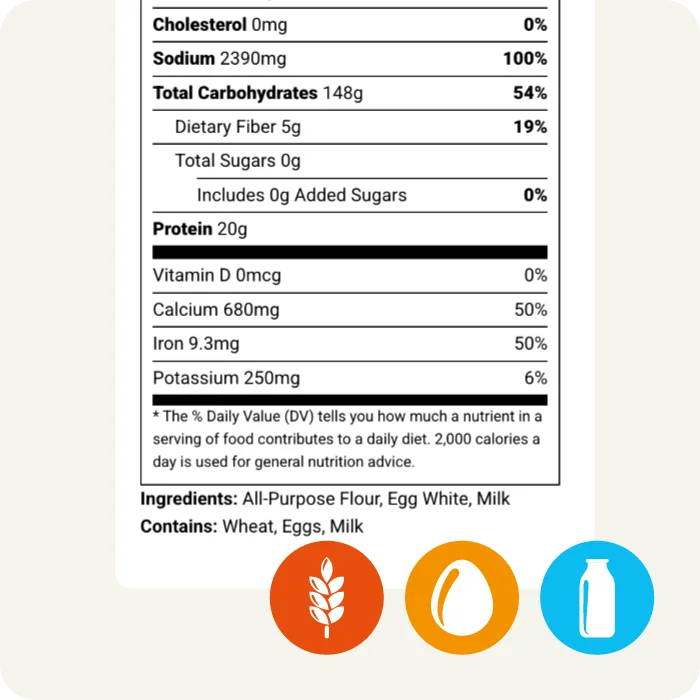- Allergen Declarations & Health Claims: Automatically detect allergens and identify FDA-compliant claims like “Low Fat” or “High Protein.”