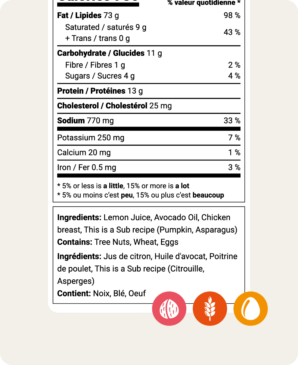 Lorsque vous créez une recette et entrez les ingrédients, notre détecteur d’allergènes intégré scanne automatiquement chaque article afin d’identifier les principaux allergènes nécessitant une déclaration.