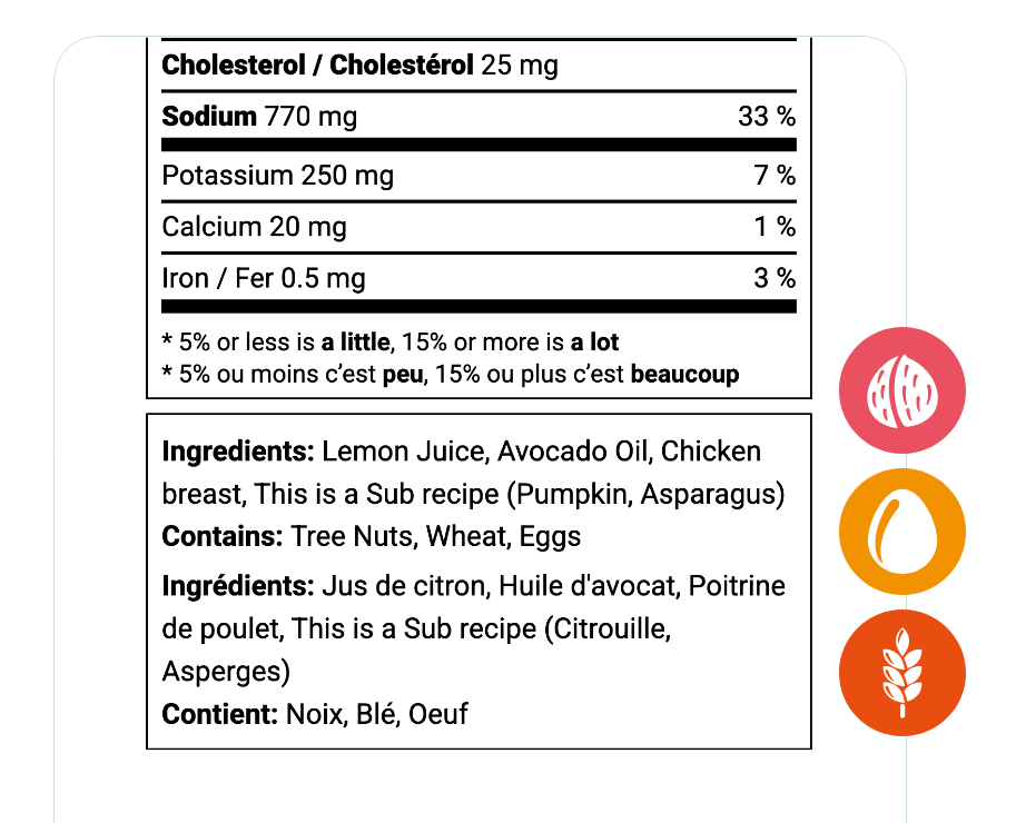 Lorsque vous créez une recette et entrez les ingrédients, notre détecteur d’allergènes intégré scanne automatiquement chaque article afin d’identifier les principaux allergènes nécessitant une déclaration.