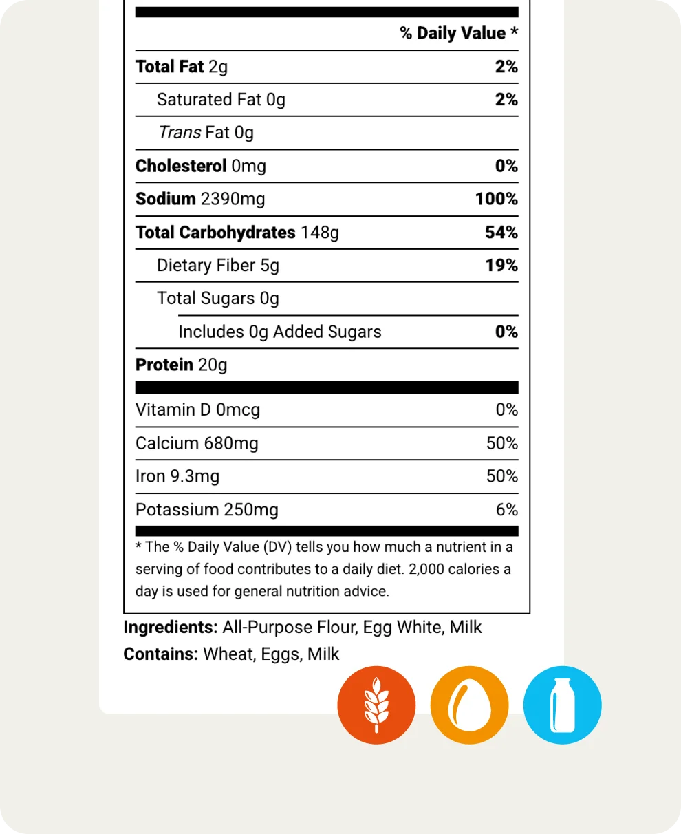 As you create a recipe and input ingredients, our built-in allergen detector automatically scans each item to identify any of the major allergens that require declaration.