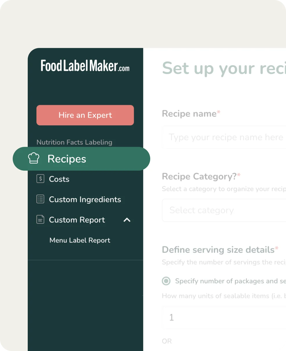 Start by either accessing an existing recipe, or create a new one through the easy-to-use Food Label Maker dashboard.
