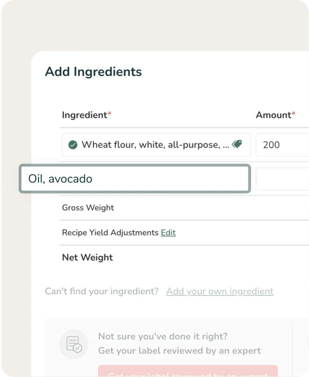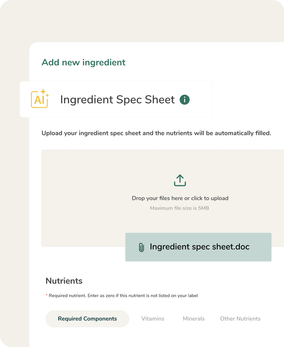 If you can’t find your ingredient, simply create your own. You can manually enter its nutritional information or upload a specification sheet, and our AI assistant will fill in the relevant information.