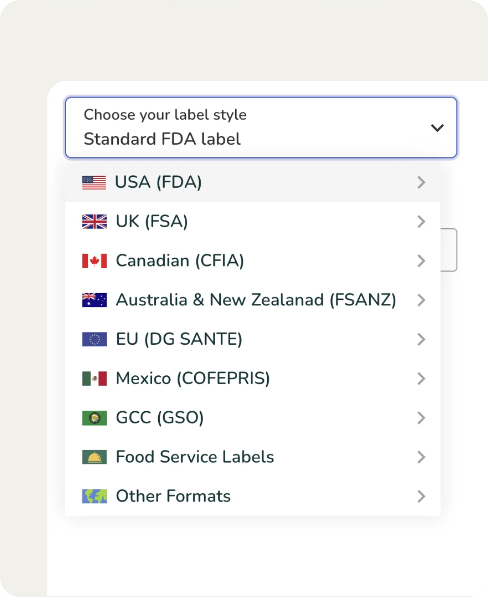 Click on the dropdown “Choose your label style” and select your chosen country or market, such as the US (FDA), Canada (CFIA), or the UK (FSA).