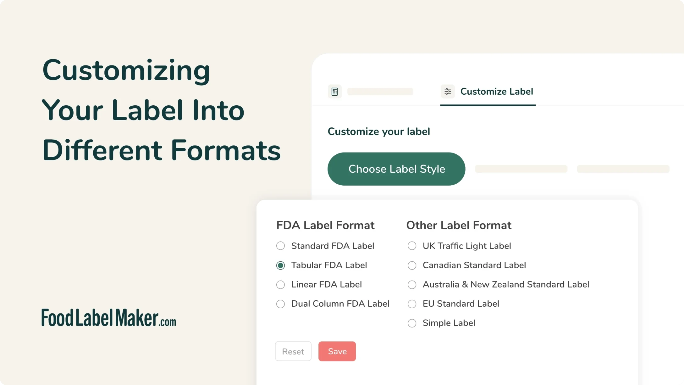 Click on the dropdown “Choose your label style” and select your chosen country or market, such as the US (FDA), Canada (CFIA), or the UK (FSA).